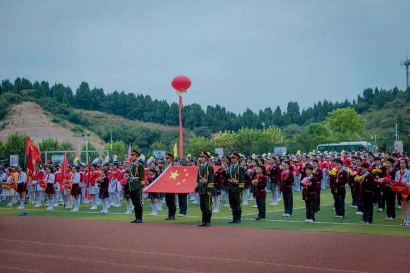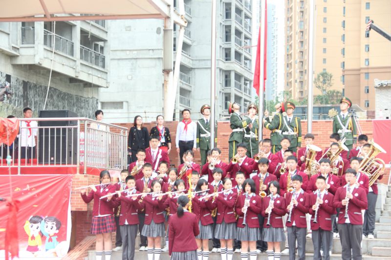 在操场集结完毕后,全体师生起立,齐唱国歌和《中国少年先锋队队歌》。国歌和队歌的伴奏均由天问教育集团管乐团现场演奏,他们以完美的演绎和昂扬的仪态,成为展演中一道亮丽的风景线。