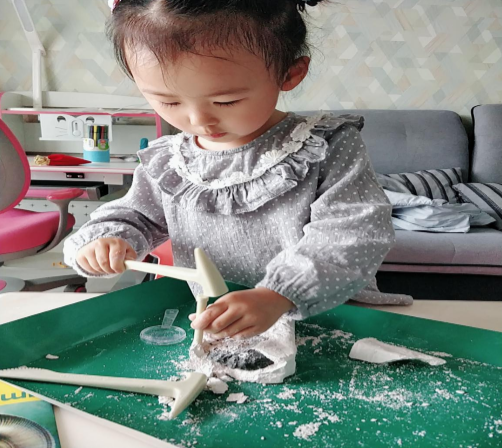 在阅读《恐龙百科全书》中的史前动物章节时,她对三叶虫和鹦鹉螺产生了浓厚的兴趣,我们又买来化石考古玩具,陪她体验了考古学家们利用工具挖掘化石的过程。