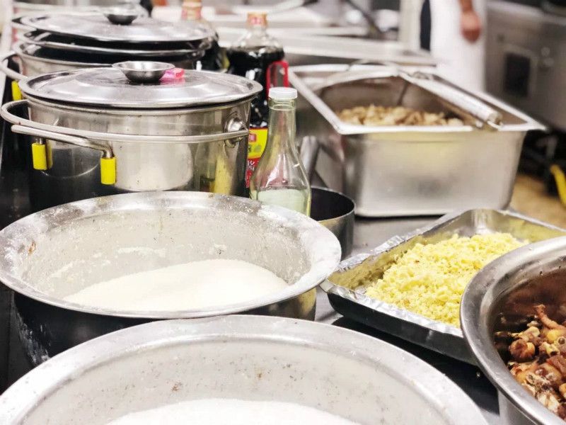 工作人员推着小推车,穿梭在桌第之间,一屉屉冒着热气的包子、馒头,一锅锅清香入味的茶叶蛋,一盘盘晶莹透亮的蛋炒饭上桌……