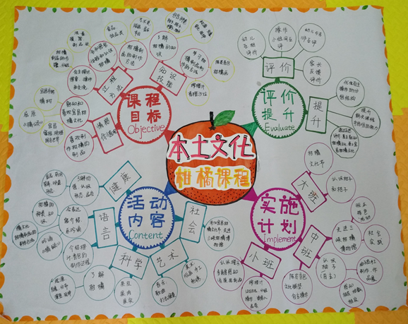 那么怎样将宜昌柑橘文化的地方资源有机的渗透在幼儿教育中,激发幼儿对柑橘文化的热爱、对家乡和传统文化的热爱呢?纲要中也明确规定,要培养幼儿爱家乡、爱祖国、爱劳动、爱集体的情感作为保教目标之一。如何将柑橘文化活动与我们的自主教育有机结合呢,为此我设置了课程目标:第一、熟知柑橘的知识;第二、乐意动手制作与柑橘有关的食物、用品等。第三、喜欢柑橘文化,乐意做宜昌柑橘文化的“代言人”。