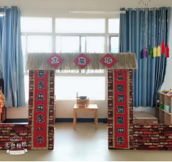 创设和石磨文化有关的环境,营造浓郁的文化特色,促进幼儿在环境中获得初步的审美体验。室内大环境主要以土家文化为背景,如吊脚楼图片、美食制作步奏图、以草房子为背景创设“土家风情”的区角,给孩子创设最有利的环境,感受最真实的场景,让幼儿可以身临其境的参与其中,给幼儿以真的启迪、实的操作、美的享受。