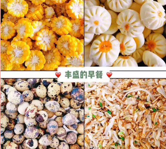 瘦肉包、肉丝面、葱油饼。发糕,五香鹌鹑蛋,蒸鸡蛋等,还有蒸玉米,蒸红薯等粗粮再加上红豆薏米粥、小米红枣粥、八宝粥、黑芝麻糯米粥、山药大米粥等等的营养粥,粗细搭配,主副食花样一周不重复,我们为孩子制定营养均衡,色香味形的早餐。