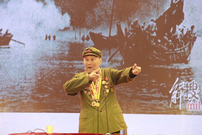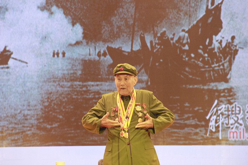 回顾完战事后,在全体师生的敬礼中,曹芝芬爷爷缓缓走上舞台,95岁高龄的他,身体依然硬朗,精气神儿十足,眼里闪着光。整整一小时,曹爷爷挺直身板,向我们娓娓道来6年的抗战生涯,从山东打到东北,再由东北打到海南,在环境恶劣、物资匮乏的艰苦条件下咬紧牙关,坚持作战。
