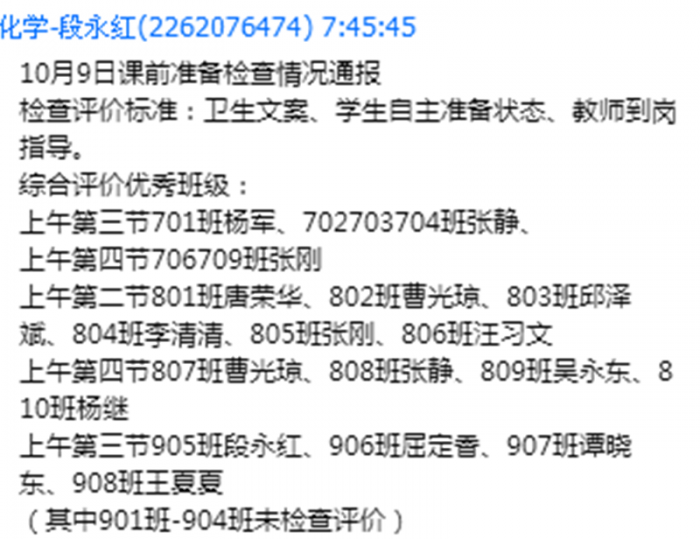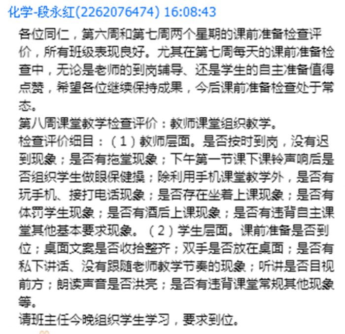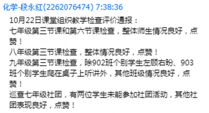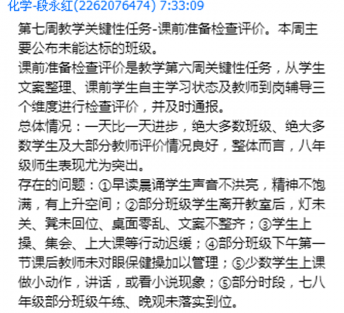 课前准备检查中,从卫生文案,到学生自主准备状态,到教师的到岗辅导,课程中心都给予了明确的指导。而课堂教学评价,则从教师和学生两个层面进行,包括教师是否按时到岗,有无拖堂情况,是否体罚学生,是否违背自主课堂其他要求,学生文案是否整齐,是否私下讲话,朗读声音是否响亮,是否有违背课堂常规现象等。课程中心坚持每天检查,每天通报,大大改善了课堂常规,有力促进了教学工作的开展。