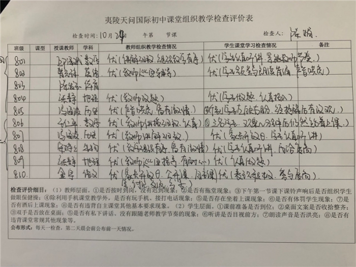 十月以来,夷陵天问国际初中课程中心强化教学常规检查,将检查重点细化为多个关键性任务,如课前准备和课堂教学等,并制定出教师层面和学生层面的评价点,指向性明确,评价具体,既为教师和学生提出了详细的要求,也促进了教学工作向更高的目标迈进。