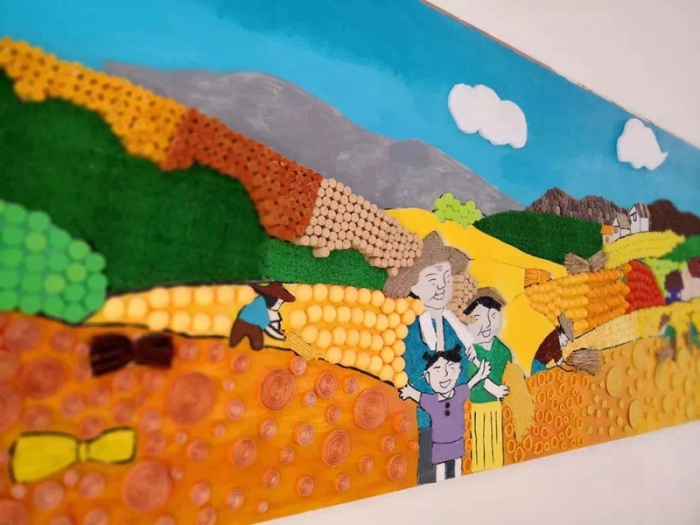 现在回想起来,我对于园所二楼触摸墙完成过程仍然记忆犹新。田园长和我多次沟通后,确定了主题以及材料。在制作中,我和黎老师、龙老师对材料进行不同组合,再进行粘贴,每天手上都粘着胶水。