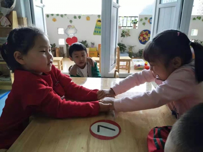 两个小朋友用力拉手,力就在两个小朋友手中。