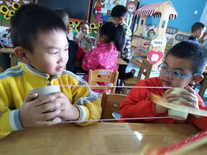 “老师,我们把皮筋放在两个杯子中间拉一下,就有了拉力!”