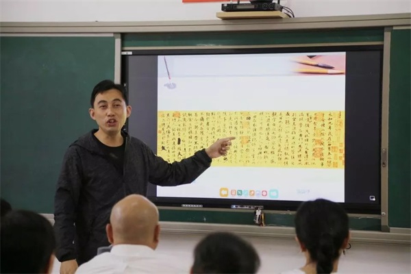 中国书法是中华民族独有的艺术形式和精神载体,历经千年。它是中华民族精神和文化的表达,在最简约的层面上浓缩了中华文化的基本精神。汉字书法为汉族独创的表现艺术,被誉为:无言的诗,无行的舞;无图的画,无声的乐等。本次讲坛是由陈孜淼爸爸给同学们带来的书法文化——“沉醉书海,弘扬国粹”。