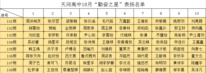 天问高中10月“勤奋之星”表扬名单