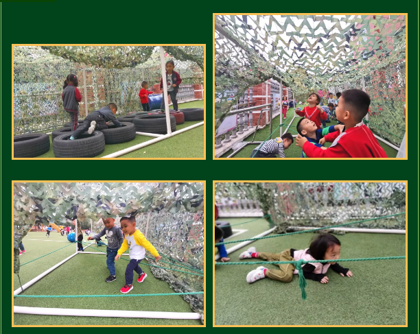 迷彩营地是我园自创的游戏活动项目,深受孩子们的喜爱,不仅满足了孩子的兴趣,还能让他们在游玩的过程中,训练自身的攀爬、走、跑、跳等等能力,让孩子通过愉悦的方式来提升身体素质,同时也可以实现孩子们的“小军人梦”!