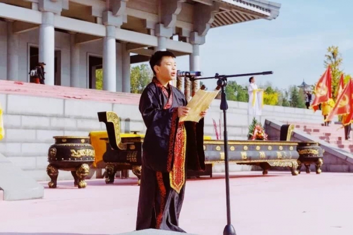 穿过九孔桥,师生在大殿前的广场上庄严肃穆地举行祭祖仪式。伴随击鼓九通,鸣钟九响,袁校长敬上高香,孙主任读祭文,“烈山苍苍,姜水汤汤。愿我先祖,恩泽绵长。奉祀于兴,利在攸往。颐冀来年,圣光再仰!”面面旌旗卷舒招展,昭昭赤子之心激荡,全体师生一起向中华民族的人文始祖鞠躬行礼,祈福国家繁荣昌盛,祈愿莘莘学子弘扬民族精神,励精图强,铸就书小辉煌!