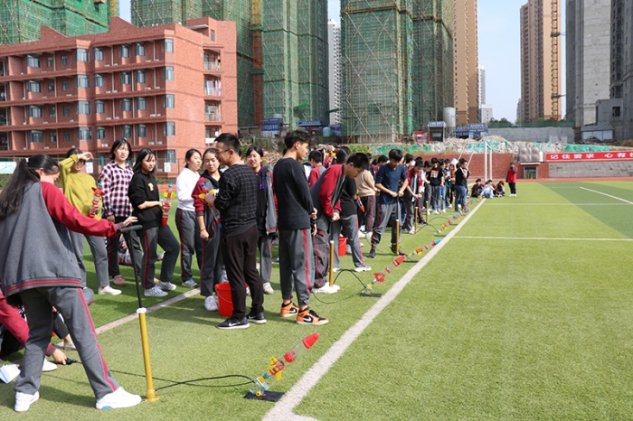 同学们一个个迫不及待地奔向操场,在发射台上安装固定好水火箭。“发射!”随着一声令下,十枚水火箭像离弦的箭冲向天际,引得同学们阵阵欢呼声。水火箭发射或近或远,老师鼓励同学们思考水火箭的远近与装入水量和发射角度之间的关系,在同学们的不断尝试中,水火箭飞得越来越高!