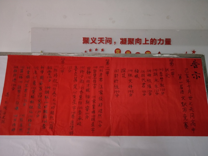 11月23日,高一年级语文组组织进行了一次古诗文背诵默写比赛。本次比赛集考点过关、文化渗透于一体,结果公布仿科举张榜,荣誉证书仿朝廷文书,别开生面,寓教于乐,引起了学生的极大兴趣。最后评选出了李梦取等一甲状元、榜眼、探花6人。