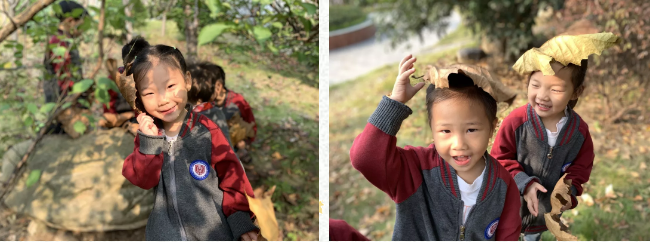 我们喜欢不同的角色,不同身份的装扮,戴上自己做的叶子面具,化身搞怪小精灵,同伴乐的笑呵呵。