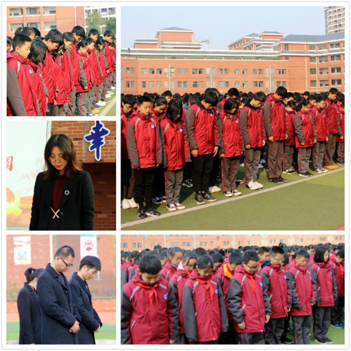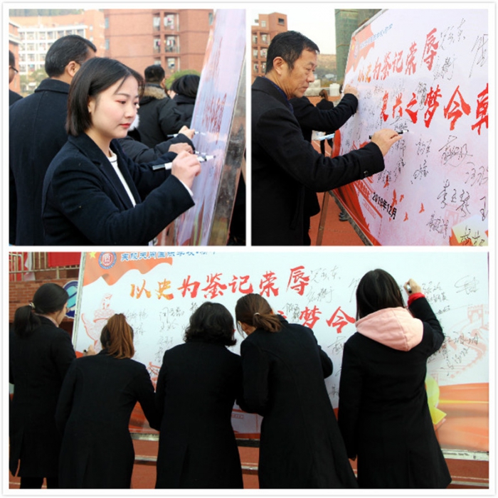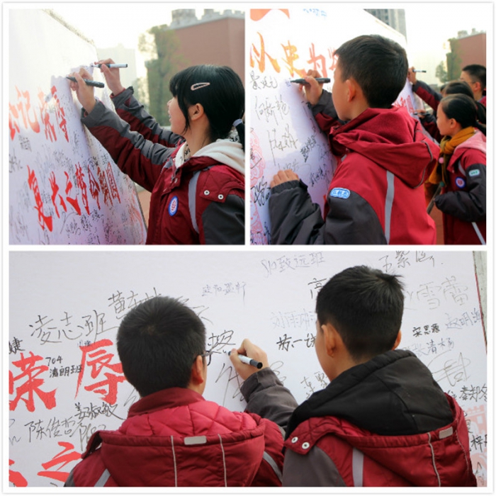 为南京大屠杀三十万死难者默哀一分钟后,全体教师和学生代表纷纷在写有“以史为鉴记荣辱,复兴之梦今朝圆”的签名板上郑重签下自己的名字,表达了维护人类和平、努力实现中国梦的决心。
