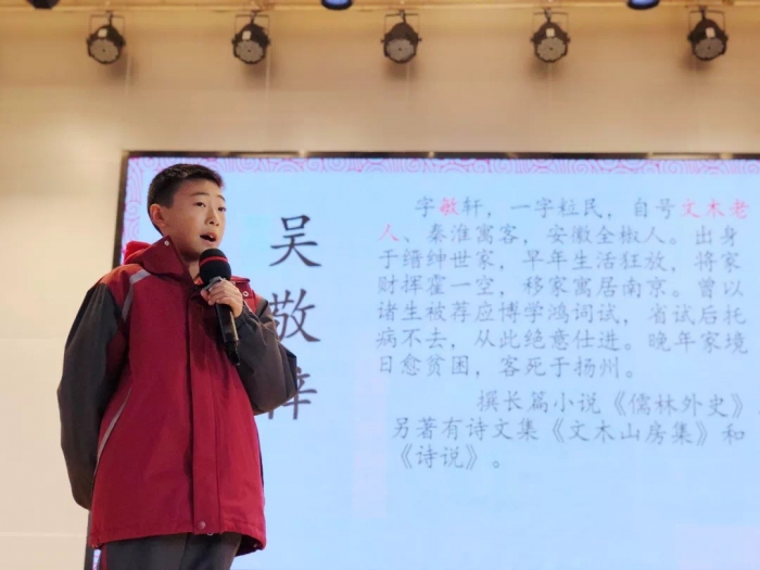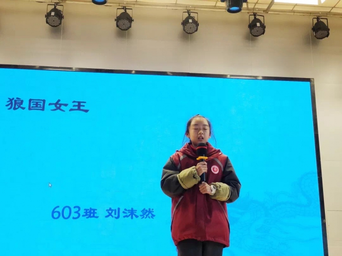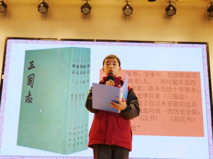 601班陈毅武同学用《三国演义》电视剧中音乐开场,分享《三国志》中的故事与读后感悟,让同学们领略到两本名著之间的碰撞与交融。