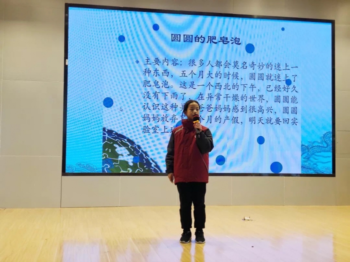 501班范钰鋆同学讲述了《2018》中喜欢肥皂泡的圆圆成功实现水资源调运的故事;