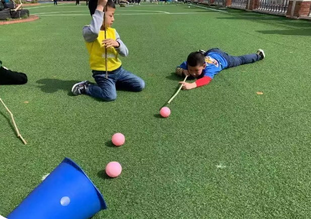 桌球的桌子太高了,球太重,不太适合我们玩。于是我们就把海洋球拿到了草坪上,捡几根竹竿,于是我们也有了属于我们自己的斯诺克。