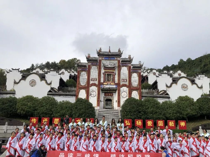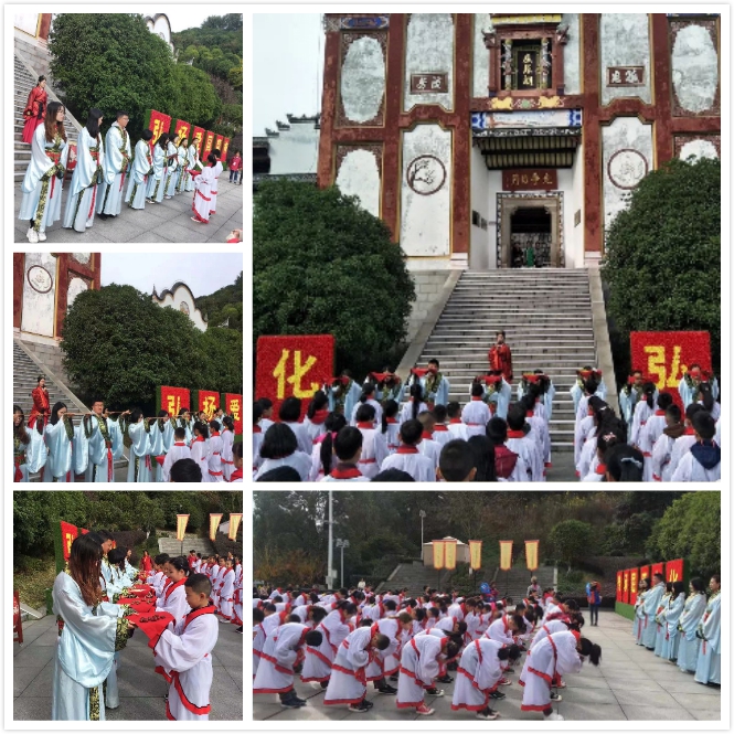 今天的第一堂研学课程是山门礼拜。同学们在屈原祠山门前穿楚服,行拜师礼仪。