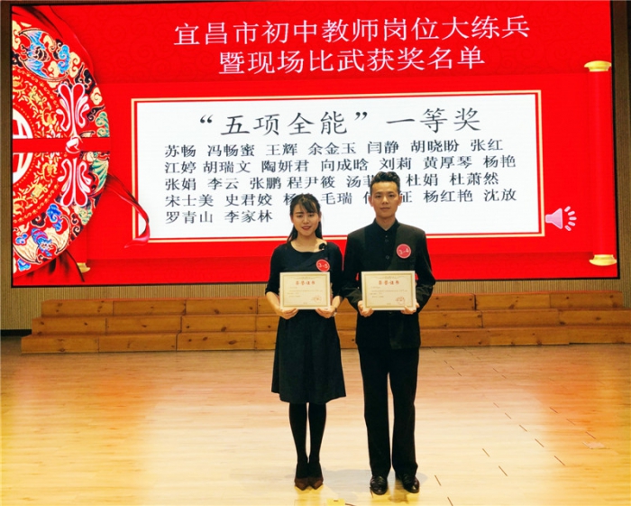 11月27日,宜昌市教师岗位大练兵暨现场比武正式落下帷幕,夷陵天问国际初中陶妍君、张鹏程两位老师代表夷陵区参加此次活动,以其过硬的专业素质和优秀的才艺展示获得“五项全能”一等奖的好成绩。