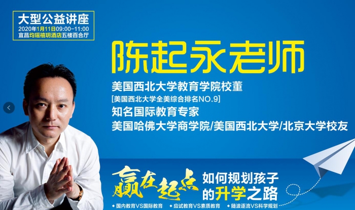 美国西北大学教育学院校董、美国哈佛大学商学院/美国西北大学/中国北京大学校友、知名国际教育专家陈起永老师将于1月11日举办大型公益讲座,诚邀九年级家长参加,聆听大师的教育智慧,分享专家的教育心得,规划孩子的学业生涯!