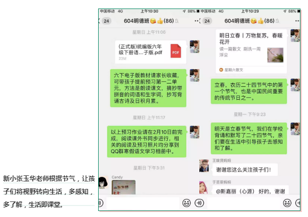 天问国际小学401班常思爱老师引导学生科学安排居家学习和生活,提升亲子陪伴质量。学生和家长在家每天锻炼十分钟、共读一本书、同唱一支歌、做一次家务、诵读古诗等。大家自发将在家的学习生活情况“晒”到群里,班级群内其乐融融。
