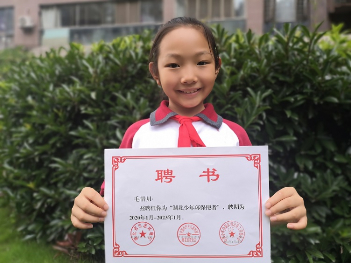 高新天问小学毛惜贝同学当选湖北少年环保使者