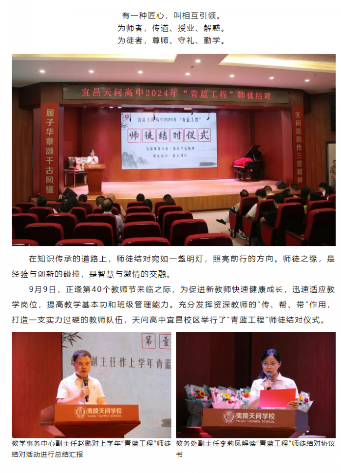 9月9日,正逢第40个教师节来临之际,为促进新教师快速健康成长,迅速适应教学岗位,提高教学基本功和班级管理能力。充分发挥资深教师的“传、帮、带”作用,...