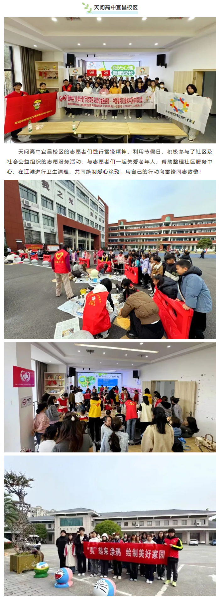 天问高中宜昌校区的志愿者们践行雷锋精神,利用节假日,积极参与了社区及社会公益组织的志愿服务活动。与志愿者们一起关爱老年人、帮助整理社区服务中心、在江滩...
