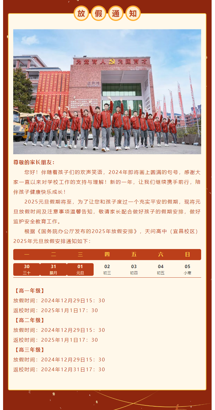 天问高中(宜昌校区)2025年元旦放假通知及安全温馨提示...