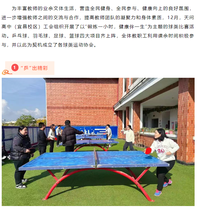 为丰富教师的业余文体生活,营造全民健身、全民参与、健康向上的良好氛围,进一步增强教师之间的交流与合作,提高教师团队的凝聚力和身体素质,12月,天问高中...