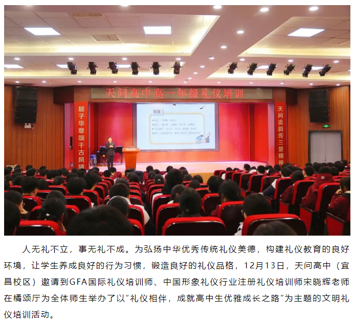人无礼不立,事无礼不成。为弘扬中华优秀传统礼仪美德,构建礼仪教育的良好环境,让学生养成良好的行为习惯,锻造良好的礼仪品格,12月13日,天问高中(宜昌...