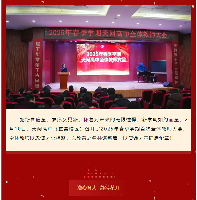 蛇衔春信至,岁序又更新。怀着对未来的无限憧憬,新学期如约而至。2月10日,天问高中(宜昌校区)召开了2025年春季学期首次全体教师大会,全体教师以赤诚...