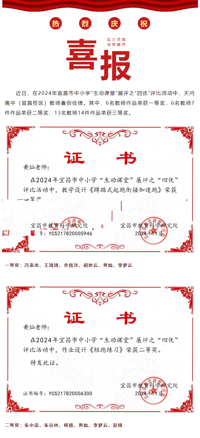 近日,在2024年宜昌市中小学“生动课堂”展评之“四优”评比活动中,天问高中(宜昌校区)教师喜创佳绩。其中,6名教师作品荣获一等奖,6名教师7件作品荣...
