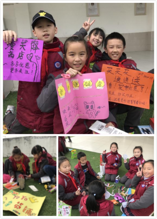 二至四年级的学生在室外平台,通过出售商品,自由交易,体验一回当“小老板”的感觉,这些“小老板们”不停地吆喝着招揽生意,店铺前的广告也是别出新意,场地上人来人往,热闹非凡,不仅锻炼了同学们的语言表达能力,培养了诚信的品质,也让同学们切身感受到了赚钱的不容易。