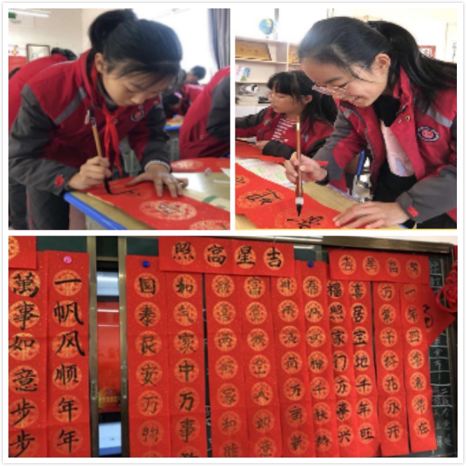 六年级的学生带来的是一场文化的盛宴,学生们一个个手握毛笔,泼墨挥毫书写新年的祝福对联,顿时教室里翰墨飘香,一幅幅火红火红的春联,正是我们中国人写好中国字的最好体现“一点一提开头要紧,横平竖直堂堂正正,一撇一捺收笔要稳,横折弯钩力度柔顺,一笔一划起伏挫顿,先意后笔翰墨有神......”