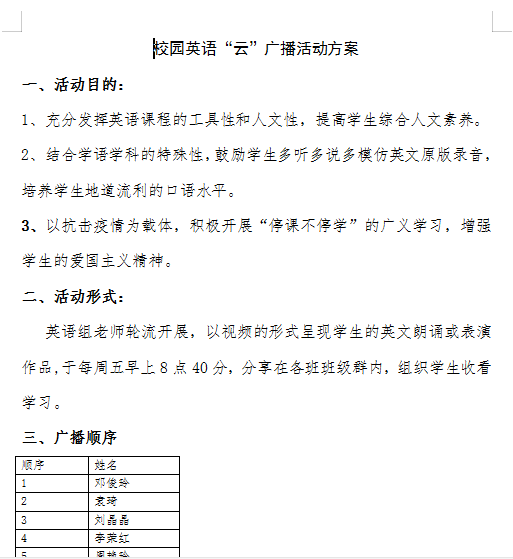 本周是孩子们宅家学习生活的第五周,为丰富同学们的线上学习生活,培养学生的口语能力,英语组全体老师群策群力,将之前的线下校园英语广播经过改良,特推出校园英语“云”广播栏目。以下是老师们拟定的活动方案和操作流程,具体到学生的每一句台词。