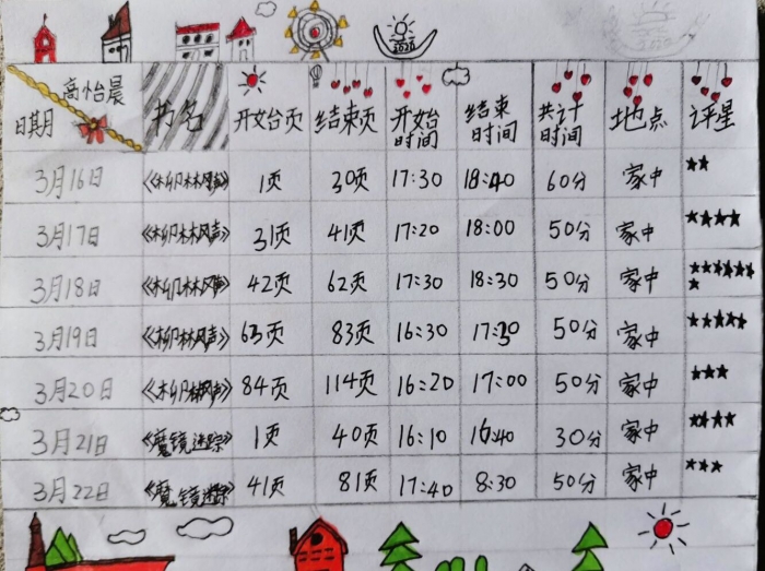 为了帮助学生形成有规划、有效率的自主阅读习惯,阅读老师根据学生们当前的情况,设计了“长假”阅读记录表。学生通过填写阅读记录表,清楚的了解了自己每天阅读花费的时间,适宜阅读的场所及读书的效果等信息。在不断记录的过程中,刷新了对时间管理的认知,克服了读整本书的畏难情绪,并为设定自主阅读旅行目标提供了有效的参考依据。