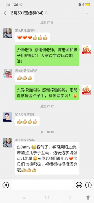501班黄梓涵妈妈在抖音上与梓涵开展亲子互动,并提议老师与学生的分别拍摄“加油”视频,形成了师生之间良好的远程互动。