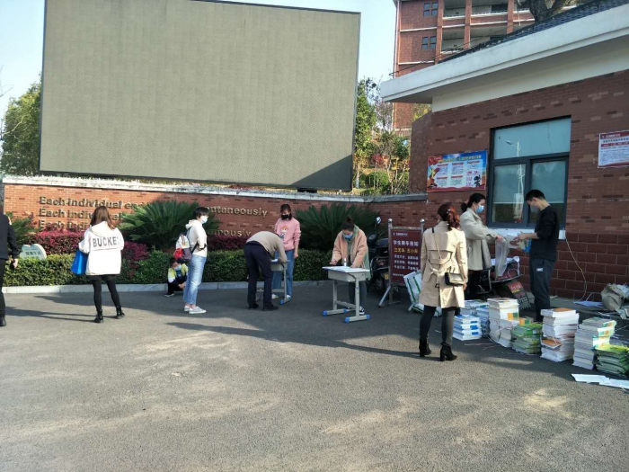 同时,学校也考虑到有特殊情况的学生,教务处采取送、寄等方式将教材发放到每个学生手中。下午6点半,阮允老师还在整理第二批需要快递教材的学生名单。已经忙了一整天的她早就累的直不起腰了,只能坐在地上与快递员接洽。毕巧萌、黄鹏程老师本来还在老家家中,接到派送任务后立即连夜赶到宜昌学校,再马不停蹄开车回去将书本送给外地学生。