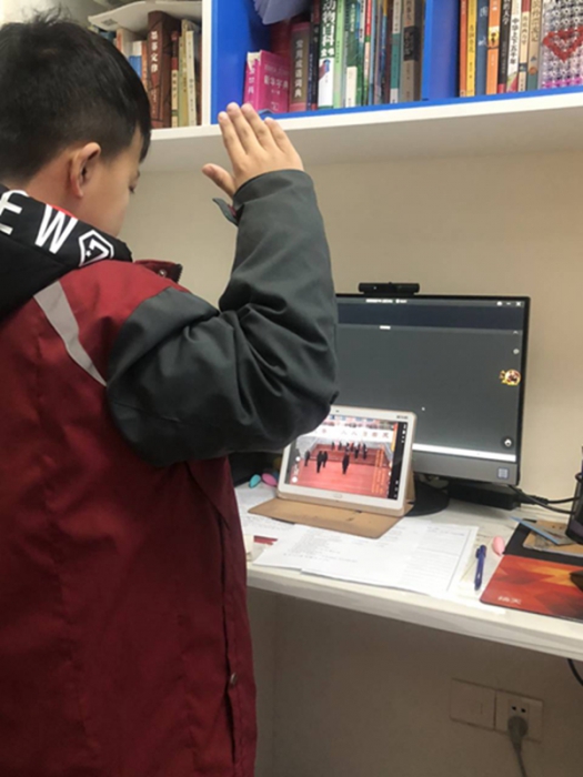 疫情线上云升旗,师生敬护旗下立。
