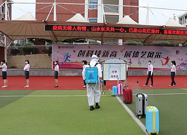 演练前,高新天问初中王发双主任对参加演练的老师在操场上进行演练培训。5月13日上午9点整“学生”们按照1米距离间隔列队,“学生”进入后不仅要经过测体温、消毒,还要通过手机扫码认证后才可进入。整个过程精细到入校、教师上课、食堂就餐、课间如厕、寝室就寝、操场体育锻炼的每一个环节进行演练。
