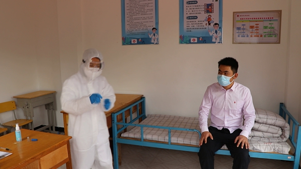 在隔离室内给体温异常的学生复查体温