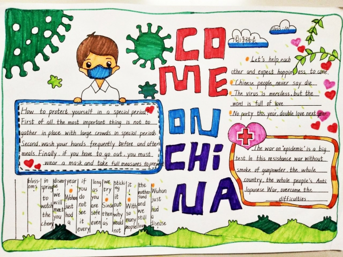 高一学子将居家的学习生活,感人事迹以及防疫小知识以英语手抄报的形式进行展出。有的以”普及防疫知识“为主题,有的以”最美逆行者“为主题,有的以”众志成城抗疫情“为主题,在孩子们的纸上,描绘了一幅又一幅令人感动、充满温情的画面。独特的构思、绚丽的色彩、丰富的内容大概是孩子们对“逆行者”最崇高的敬意吧!