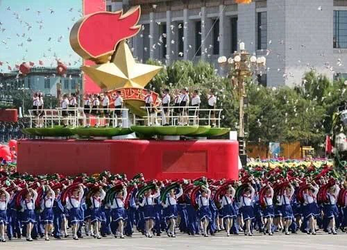 五角星加火炬和写有“中国少先队”的红色绶带组成少先队队徽。请看,2009年10月1日,在庆祝新中国成立60周年群众游行队伍中的少先队员方阵通过天安门广场时,少先队的队徽就在彩车上。 2019年10月1日,庆祝新中国成立70周年群众游行时,由2019名少先队员组成的“同心共筑中国梦”方阵,也组成了星星火炬的造型,表达少先队员听党话、跟党走,为实现中华民族伟大复兴的中国梦时刻准备着的美好理想。