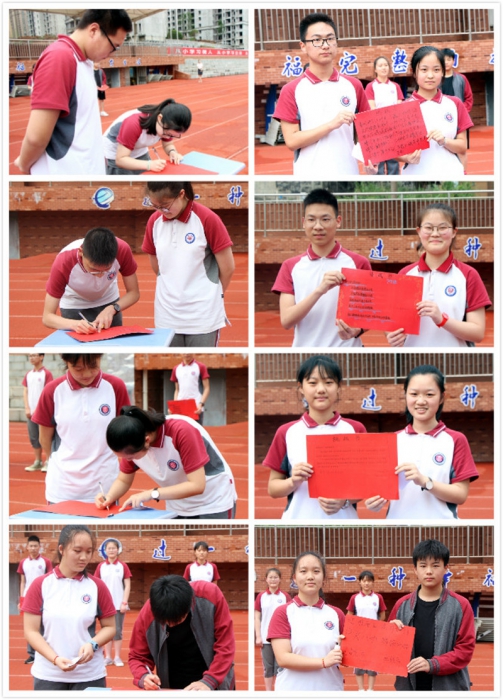 为激励斗志、强化目标,各班纷纷向对手班级发起挑战,活动现场,宣战声、应战声此起彼伏,响彻操场,表达了同学们昂扬向上的奋斗豪情。