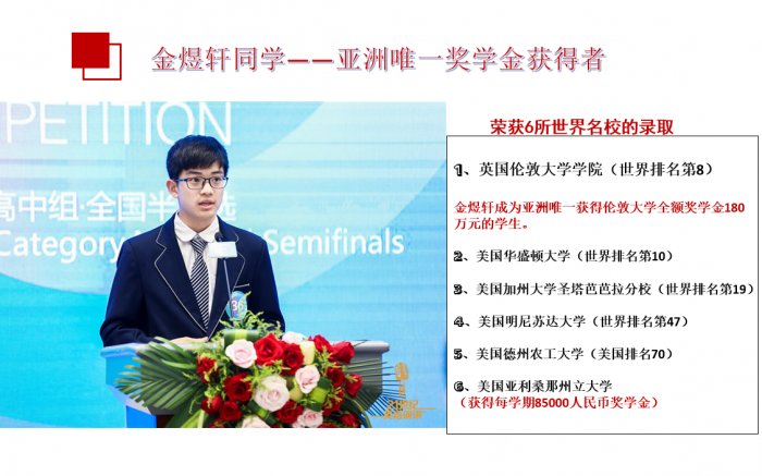 当国内高三学子正在冲刺高考时,天问国际高中2020届毕业生金煜轩同学已获得6所世界名校的录取,包括英国伦敦大学学院、美国华盛顿大学等世界排名前十的学校。同时他还是今年亚洲地区唯一获得伦敦大学学院荣誉奖学金的学生,本科三年学费全免。