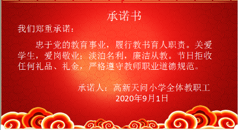 3、一份班级礼物 您可以给孩子的班级增添几盆绿植,让教室更具活力; 您可以给班级的孩子们增添一些玩具,丰富他们的课间生活; 您也可以结合自己的职业或者兴趣爱好,给孩子们上一堂家长课堂; …… 4、一份理解与支持 家长只有足够理解老师,高度契合老师,支持老师的工作,才能让教育的力量最大化的呈现。 坚持教育公平 关注全体学生 平等关爱每一个孩子 高新天问小学全体教职员工 向所有的孩子、家长、社会 郑重承诺: