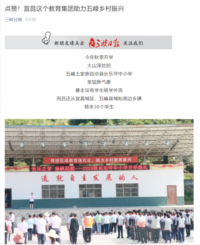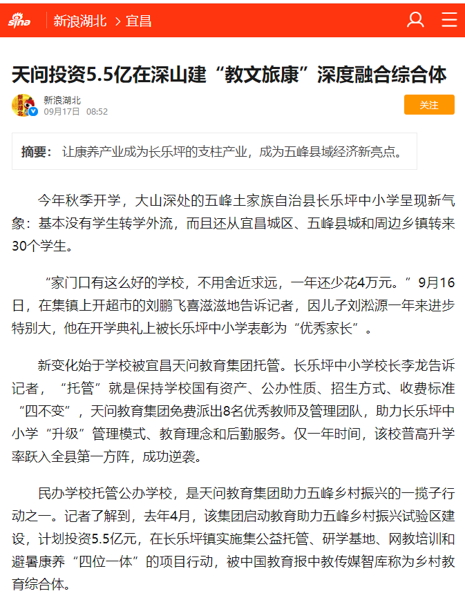 去年4月,天问教育集团启动教育助力五峰乡村振兴试验区建设,计划投资5.5亿元,在长乐坪镇实施集公益托管、研学基地、网教培训和避暑康养“四位一体”的项目行动,被中国教育报中教传媒智库称为乡村教育综合体。